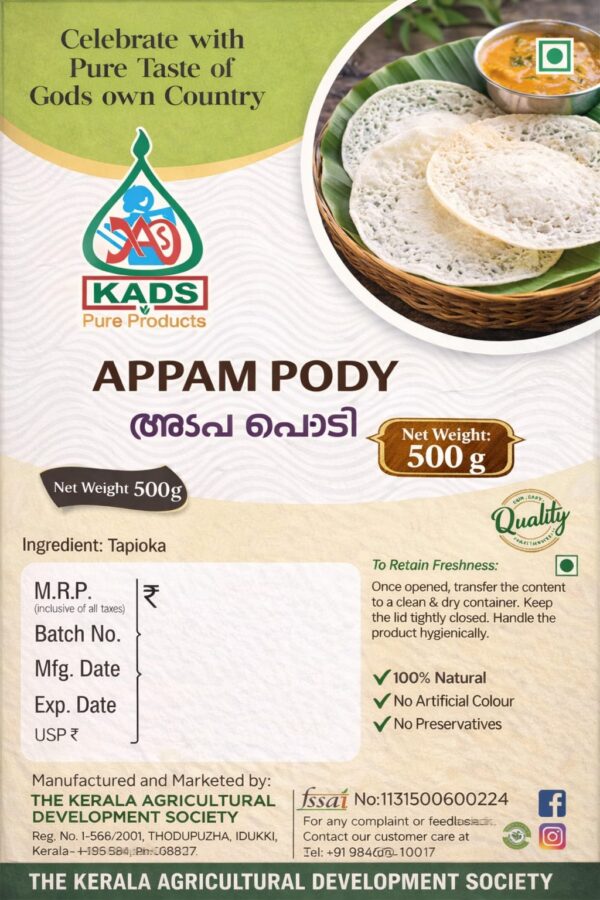 Authentic Appam Podi by KADS, made from carefully selected rice and finely processed to help you prepare soft, fluffy, and traditional Kerala-style appam with ease. Appam powder, enriched with quality greens, is available in 500 gram and 1 kilo packs.
