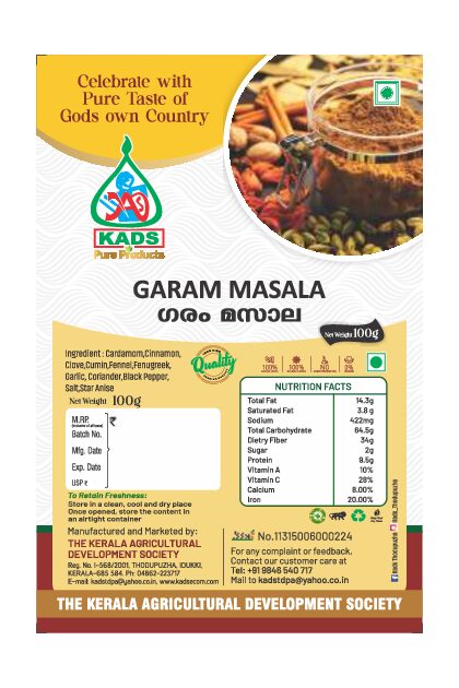 Authentic Garam Masala by KADS, crafted with the perfect proportion of natural Kerala spices to deliver a rich aroma and balanced flavor in every dish.