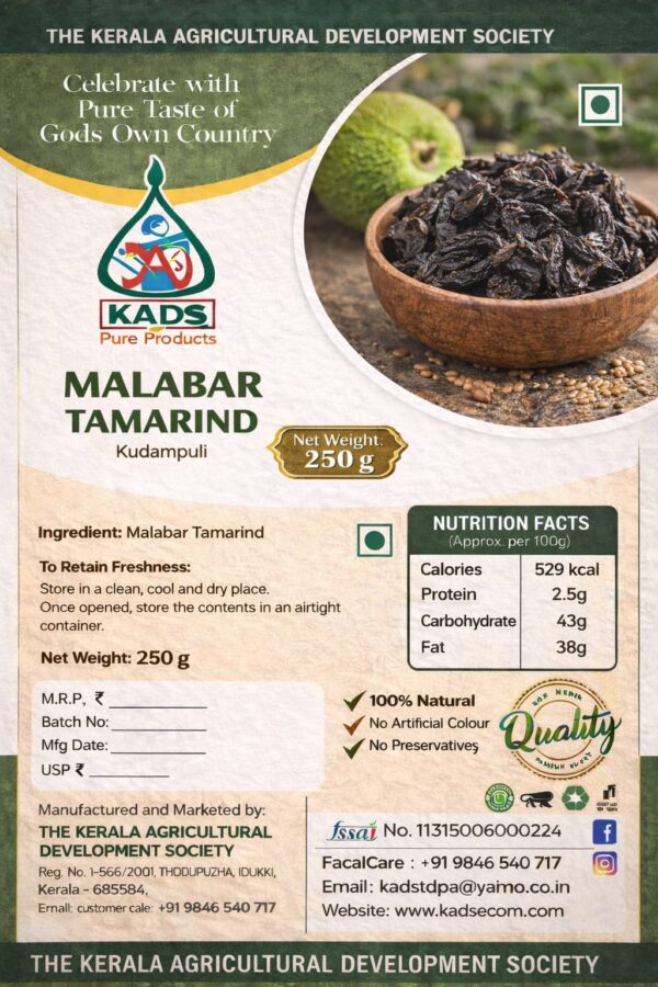 Premium Malabar Tamarind by KADS, carefully selected from Kerala to deliver its natural sourness, rich flavor, and authentic taste for traditional cooking.