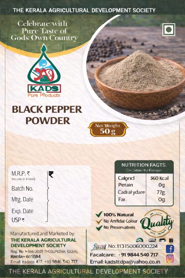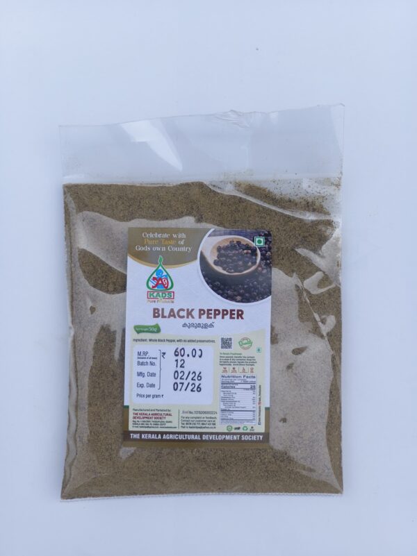 Quality local black pepper collected under the organic mango project of Kads is available in powdered form, 50 grams and 100 grams packs.