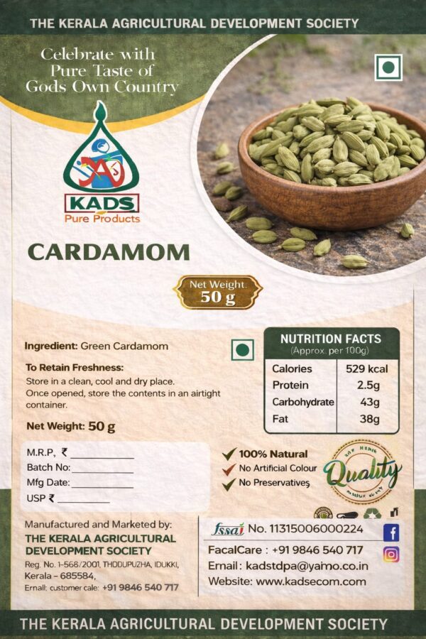Premium Cardamom by KADS, carefully sourced from the hills of Idukki to deliver rich aroma, natural flavor, and the authentic taste of Kerala.