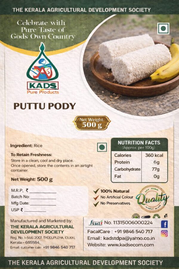 Traditional Putt Podi by KADS, made from carefully selected rice and hygienically processed to deliver soft, fluffy, and authentic Kerala-style puttu every time