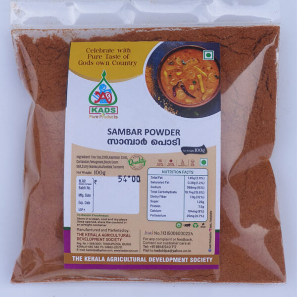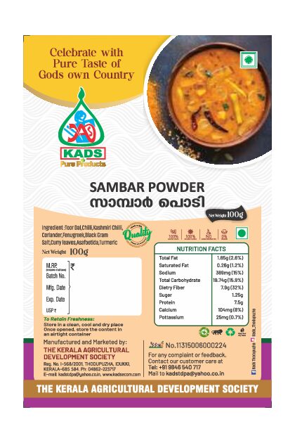 Sambar Powder by KADS, expertly blended with selected Kerala spices to bring the authentic aroma and rich taste of classic Kerala sambar to your kitchen.